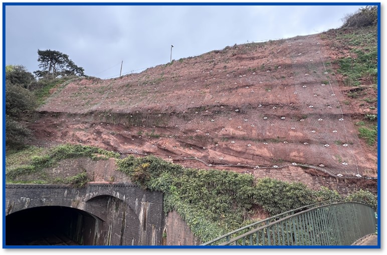 Jaring baja tahan karat TECCO® G65/3, lereng di atas rel kereta api antara Dawlish dan Holcombe, Devon Inggris